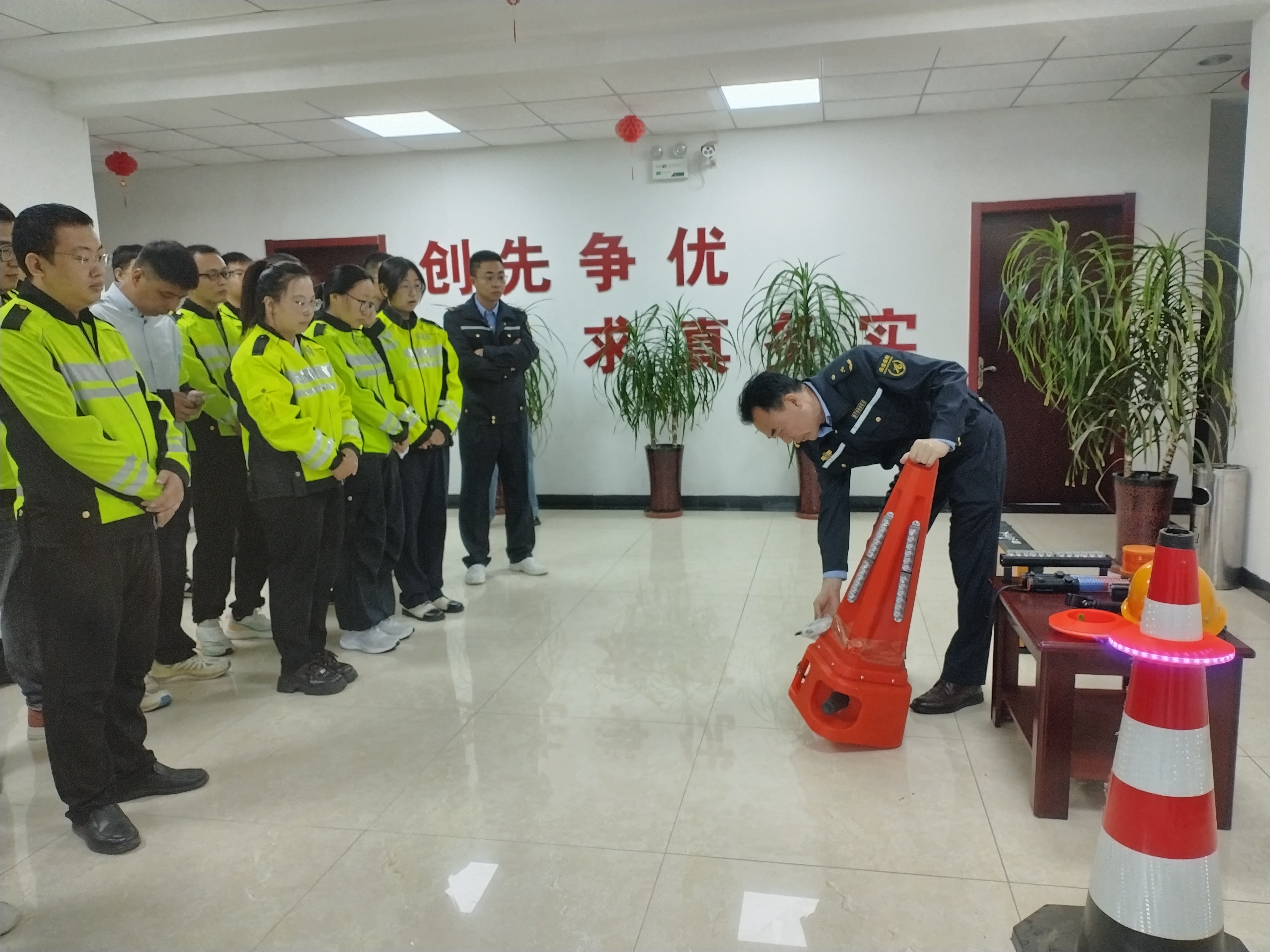 培训伊始,韩同起主任结合高速救援工作实际,聚焦“事故现场防护”核心内容,深入讲解特殊天气与不同事故场景下的安全防护策略。明确警戒设置、人员站位等要点,避免二次事故;随后结合实物,演示安全帽、警示灯、防撞桶等装备的使用技巧与场景,让队员清晰掌握“何时用、如何用、用到位”的关键要点。